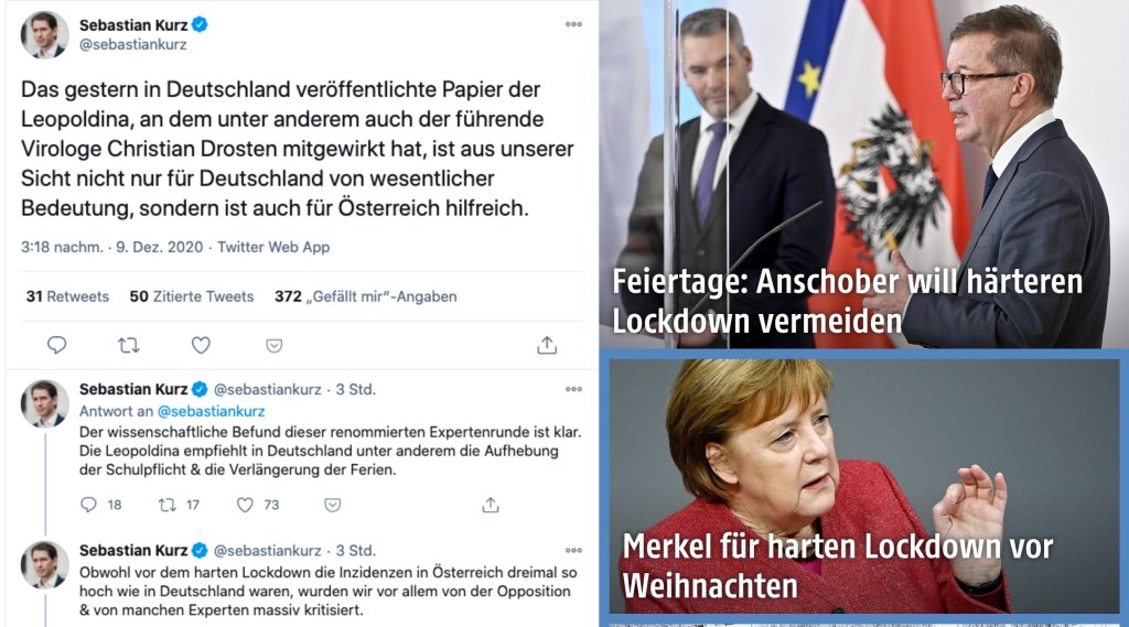 Österreich hat den gern bemühten Status als Musterschüler schon lange verloren. Das mediale Bild vom „Krisenmanager Kurz“ erscheint heute in einem doch gar anderen Licht: Man sieht seit Monaten ja, wie sich demokratische Regierungen allerorts schwertut, die unterschiedlichen Interessen und (-gruppen) auszubalancieren. Den Vorwurf, reichlich spät gehandelt zu haben, muss sich die österreichische Regierung dennoch mehr als gefallen lassen.