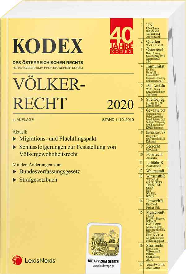 Beschreibung auf der Facultas-Website: Das vorliegende Lehrbuch bietet eine konzise und zugleich innovative Darstellung des Völkerrechts. Die Aufbereitung des Stoffs aufgrund von Erfahrungen aus der Lehre und mit praktischen Beispielen soll dem Leser das Verständnis auch hochkomplexer Bereiche erleichtern. Ein Schwerpunkt liegt dabei auf den konkreten Fragen, die sich im Zusammenspiel von Völkerrecht und der österreichischen Rechtsordnung stellen. Analogien und Verweise zum innerstaatlichen Recht ermöglichen dabei einen leichteren Zugang zum Verständnis des Völkerrechts. Der Abdruck von Fallpassagen sowie zentraler Rechtsbestimmungen in deutscher Sprache bietet eine rasche Orientierung hinsichtlich der relevanten Materialien. Weiterführende Fragen am Ende jeden Kapitels erlauben eine zielorientierte Prüfungsvorbereitung. Index und Kapitelverweise sollen zugleich die Verwendung als Nachschlagewerk und Einführung in die verschiedenen völkerrechtlichen Teilgebiete ermöglichen. Bestellbar unter anderem bei amazon oder facultas.